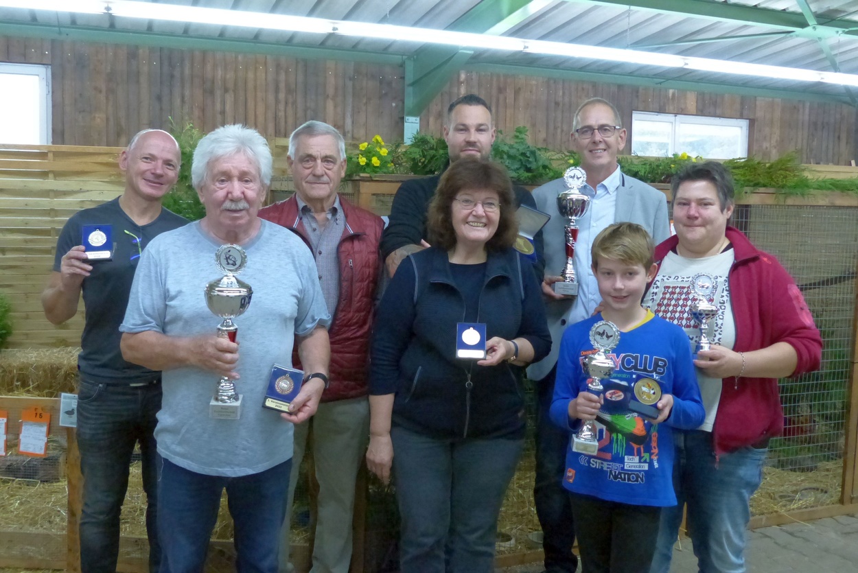 Nachfolgend die Preisträger der diesjährigen Herbstausstellung: Bei den Kaninchen-Züchtern wurde Wolf Nübling Vereinsmeister mit „Zwergwidder weiß“, gefolgt von Sandra Eckmann mit „Luxkaninchen“ und Reinhard Pröll mit „Deilenaar“. Jugendvereinsmeister wurde Luca Eckmann mit „Zwergwidder weiß“. Bei den Geflügel-Züchtern waren folgende Personen besonders erfolgreich: Sandra Eckmann (Ziergeflügel), Jugendzüchter Luca Eckmann war in der Sparte Groß- und Wassergeflügel mit „Australorps schwarz“ erfolgreich. Bei den Züchtern von Groß- und Zwerghühnern gab es ebenfalls ausgezeichnete Erfolge, nämlich Gerlinde Dufner (Rheinländer), Michael Doninger (Zwerg Sundheimer) und Sandra Eckmann (Antwerpener Bartzwerge). Lioba Albers wurde für ihre Lockentauben ausgezeichnet. Beste Zuchtdurchschnitte zeigten Michael Doninger, Gerlinde Dufner und Sandra Eckmann.