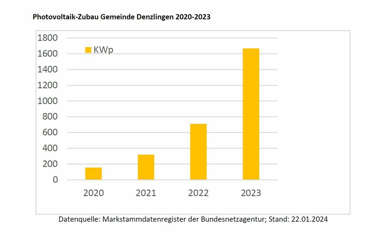 In Baden-Württemberg wurden im Jahr 2023 neue Photovoltaikanlagen mit insgesamt 1.857 Megawatt-Peak Leistung errichtet. Mehr als ein Gigawatt-Peak habe der Zubau über dem des Vorjahres gelegen, berichtete der Staatsanzeiger Baden-Württemberg am 19.01.2024. Auch in Denzlingen war 2023 für den Zubau an Solarstromkraftwerken ein rekordverdächtiges Jahr. Neue PV-Anlagen mit einer Gesamtleistung von 1.667 Kilowatt-Peak wurden realisiert. Dies entspricht einem Zuwachs von 135% im Vergleich zum Vorjahr. Mittlerweile erzeugen auf der Gemarkung Denzlingen PV-Module mit einer Gesamtleistung von rund 7 Megawatt-Peak enkeltauglich Strom aus Sonnenlicht.