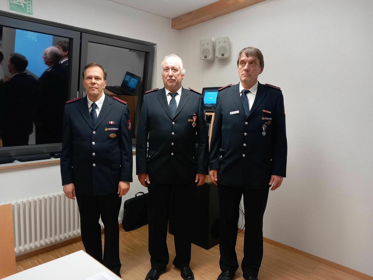 Schließlich verabschiedete der Kommandant zwei langjährige Feuerwehrkameraden, wobei er deren Engagement und ihre besonderen Verdienste nachdrücklich würdigte, nämlich nach 40 Dienstjahren Heinz Jund, der von 2001 bis 2011 Kommandant der Denzlinger Wehr war. Verabschiedet in die Altersmannschaft wurde auch Harald Nübling, der seit 1986, also „unvorstellbare 38 Jahre lang“, als Kassierer tätig war. Schließlich Professor Wolfgang Hochbruck, der noch bis Juni dieses Jahres „Schonfrist“ genieße, dann aber gerne mit „65 plus“ noch einige Jahre die Brandschutzerziehung weiterführen möge. Grußworte sprachen zuletzt Oberzunftmeister Michael Heizmann und der Stellvertretende Kommandant von Reute, Benedikt Weber.