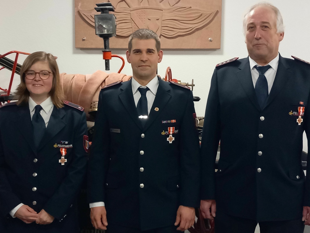 Ehrungen für verdiente Angehörige der Wehr sowie Beförderungen gab es im Rahmen der Jahreshauptversammlung ebenfalls, nämlich folgende: Kreisbrandmeister Christian Leiberich überreichte Lisa Gollent das Feuerwehr-Ehrenzeichen in Bronze für 15-jährigen Feuerwehrdienst. Das Ehrenzeichen in Silber erhielt Jens Koschella für 25 Jahre; und Heinz Jund wurde mit dem