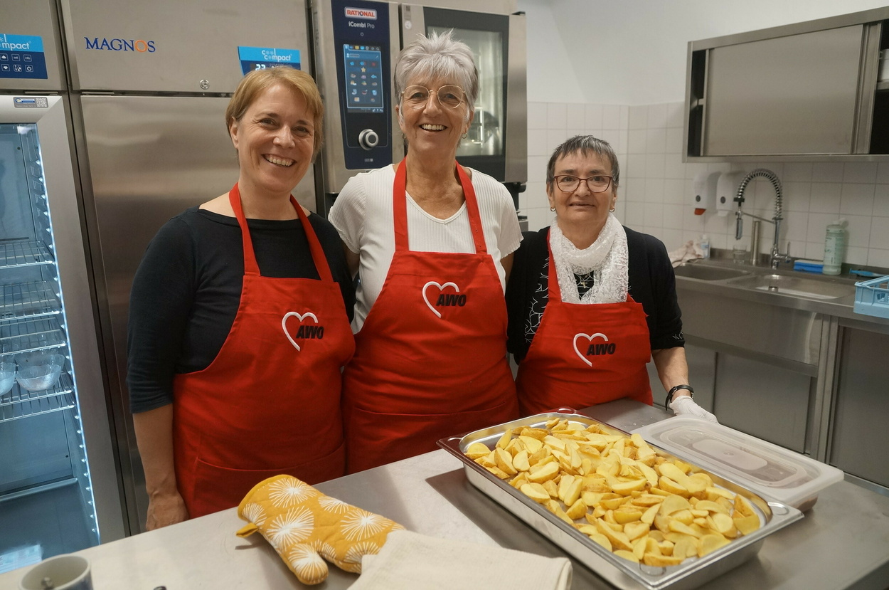 Bild 2: Ein fröhliches Mensa-Team der AWO Denzlingen in der neuen Schülermensa. V.l. Karin Wünsch (Küchenchefin Mensa Hauptstraße), Renate Schleicher (Küchenchefin im Hort Stuttgarter Straße), Marianne Weiß (Küchenhelferin Hauptstraße). Foto: AWO Denzlingen.