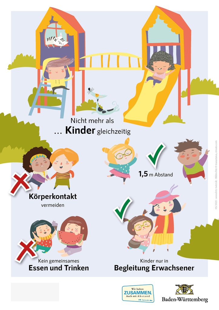 Die Landesregierung hat ihre Rechtsverordnung über infektionsschützende Maßnahmen gegen die Ausbreitung des Coronavirus am 2. Mai 2020 erneut geändert und weitere, vorsichtige Lockerungen beschlossen. U.a. wurde die Öffnung der Spielplätze, Museen, Ausstellungen und Zoos geregelt. Die Spielplätze in Denzlingen sind seit 6. Mai unter Auflagen wieder geöffnet. Gemäß den Empfehlungen des Ministeriums für Soziales und Integration