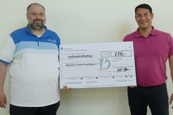 Am 31. Juli 2020 nahm Ronny Fugmann, Dirigent des Akkordeon-Vereins Denzlingen und Leiter des Projektes „Wir spielen Akkordeon und Melodica“, einen Scheck über 150 € in Empfang. Die Bürgerstiftung, vertreten durch den Vorsitzenden Bürgermeister Markus Hollemann unterstützt damit das Projekt, das Schule und musikalische Vereine vernetzt. „Das Schulprojekt bietet uns eine gute Möglichkeit Schüler an das Instrument Akkordeon heranzuführen und - wenn möglich - langfristig Nachwuchsspieler zu gewinnen“, so Ronny Fugmann. Nach Werbung und Vorsprechen konnte in den ersten Schulklassen bereits bei einigen Schülern Interesse geweckt werden. Diese erhalten über einen längeren Zeitraum qualifizierten Unterricht am Akkordeon bzw. an der Melodica.Aufgrund von der Corona-Pandemie musste das Schulprojekt unterbrochen werden. Das Projekt soll nach den Sommer-Schulferien fortgesetzt werden.