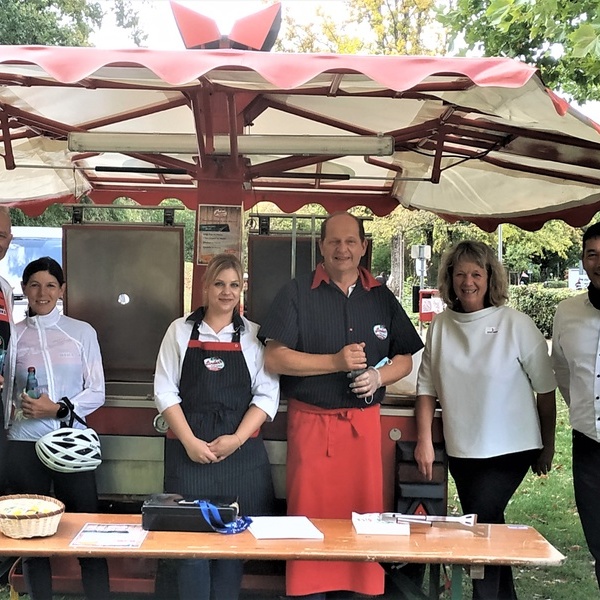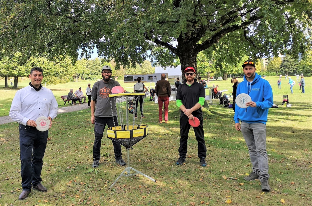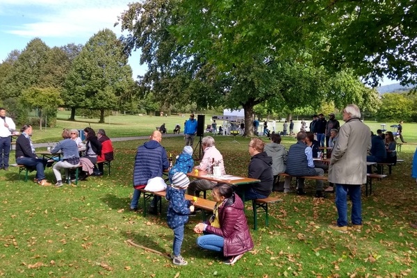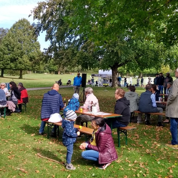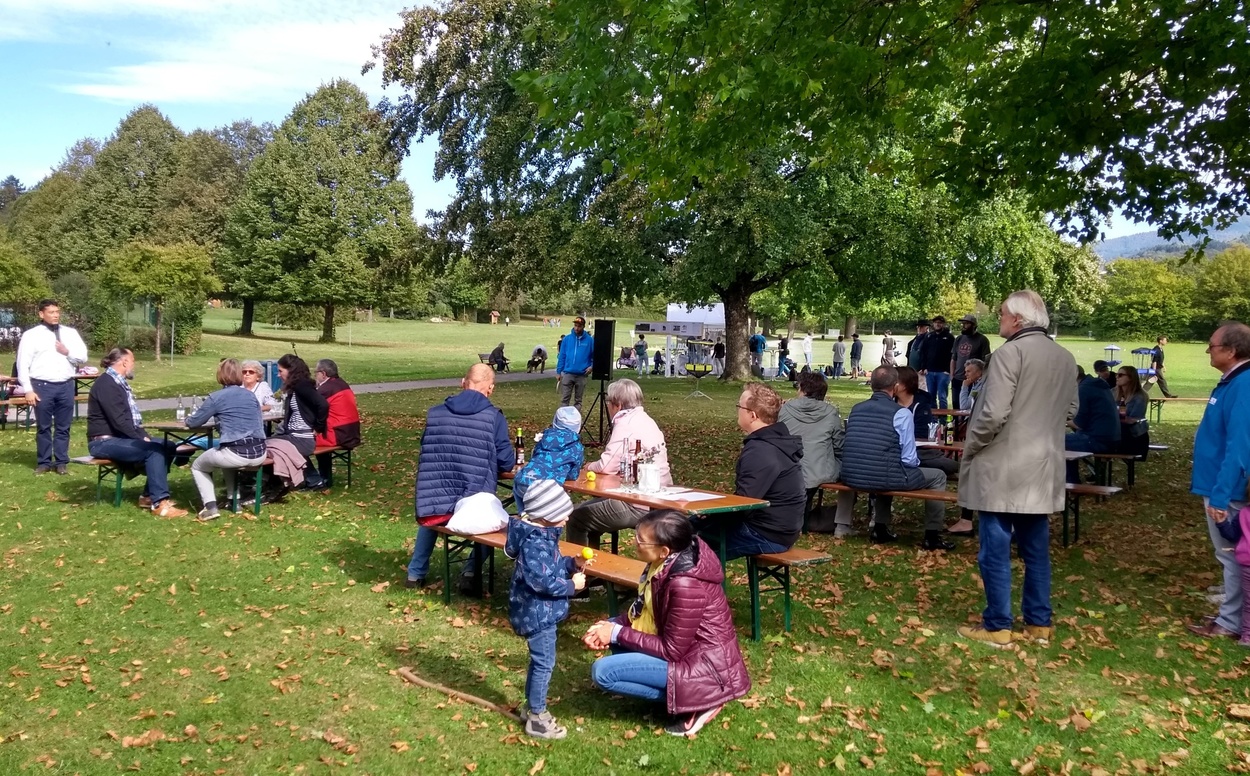 Bei herrlichem Herbstwetter war angerichtet: Bänke, Getränke, Eiswagen und ein Imbiss-Stand der Metzgerei Linder. Eingeladen hatte Bürgermeister Markus Hollemann Freiwillige, die seit Beginn der Corona-Pandemie für andere Denzlinger im Einsatz waren.25 Ehrenamtliche, teils mit Familien, haben die Danksagung der Gemeinde angenommen. Sie lachten viel und unterhielten sich angeregt, stets mit Corona-Abstand. Die Gäste fühlten sich sichtbar wohl. Zudem konnte die Sportart Discgolf ausprobiert werden.