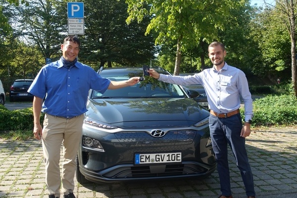 „Reichweite, Fahrkomfort und Sparsamkeit – diese Punkte waren ausschlaggebend für den Kauf eines Hyundai Kona Elektro bei der Autohaus Breisgau GmbH“, berichtet Bürgermeister Markus Hollemann (links) aus Denzlingen.Seit kurzem sind die Beschäftigten des Gemeindeverwaltungsverbandes der Gemeinden Denzlingen, Vörstetten und Reute 100 Prozent elektrisch mit Ökostrom unterwegs. „Schaut nicht nur Klasse aus, sondern liegt fantastisch auf der Straße“, „Spritzig“ oder „ich fahre nun deutlich mit einem besseren Gefühl durch die´erneuerbaren Energien´ im Tank“ – dies sind nur einige der Aussagen der neuen Fahrzeugnutzer aus den Rathäusern. Übergeben wurde das Fahrzeug von Verkaufsberater Dominik Kikisch (rechts) vom Autohaus Breisgau GmbH in Freiburg. „Wir beglückwünschen den Gemeindeverwaltungsverband zu dieser Entscheidung und wünschen allzeit gute Fahrt“, gratuliert Iris Ehret vom Autohaus Breisgau.