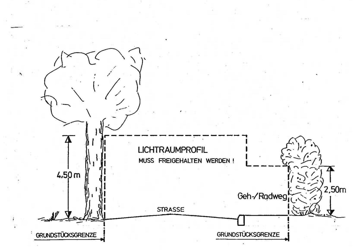 Das Grün darf die Sicht auf Ampeln, Verkehrszeichen oder Straßenbeleuchtung nicht nehmen. Anpflanzungen müssen so zurückgeschnitten sein, dass die Verkehrszeichen von allen Verkehrsteilnehmern rechtzeitig wahrgenommen werden können. Im Bereich von Sichtdreiecken an Straßenmündungen sind Anpflanzungen auf die maximale Höhe von 80 cm ab Straßenniveau zurückzuschneiden, damit in diesen Bereichen keine Verkehrsgefährdungen entstehen und die Sichtverhältnisse im Einmündungsbereich nicht eingeschränkt sind. Des Weiteren regeln die straßenverkehrsrechtlichen Bestimmungen, dass entlang von Geh- und Radwegen bis zu einer Höhe von 2,50 m und im Bereich von Straßen bis zu einer Höhe von 4,50 m keine Pflanzen bzw. Äste in den öffentlichen Verkehrsraum hineinragen dürfen.