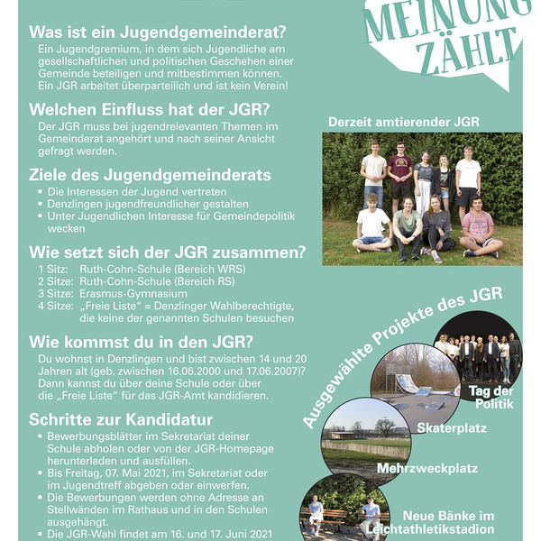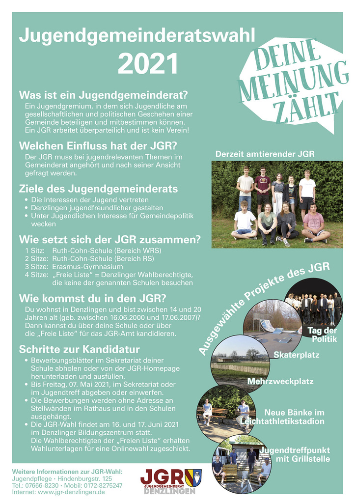 Du wohnst in Denzlingen und bist zwischen zwischen dem 16. Juni 2000 bis 17. Juni 2007 geboren? Dann kannst Du Dich über Deine Schule oder über die "Freie Liste" für das Jugendgemeinderats-Amt bewerben. Die Bewerbungsfrist endet am Freitag, 14. Mai 2021. Weitere Infos unter www.jgr-denzlingen.de und unter Tel. 0172/8275247.