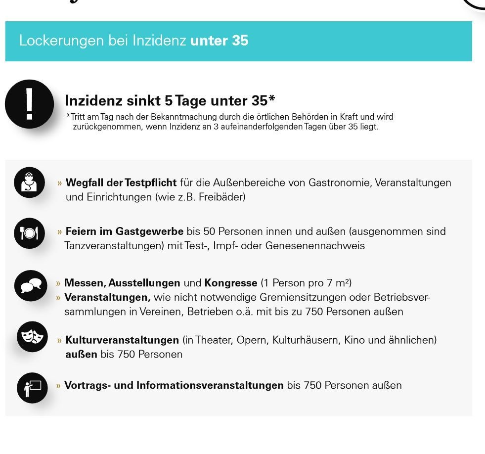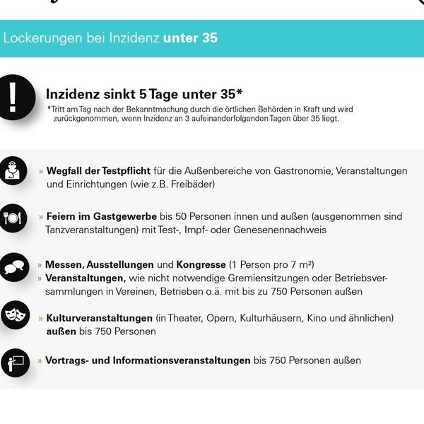 Mehr Informationen zu den Lockerungen auf der Webseite des Landkreises Emmendingen.- Öffentliche Bekanntmachung des Landratsamtes Emmendingen zur Feststellung des Vorliegens einer Inzidenz von weniger als 35 an fünf aufeinander folgenden Tagen vom 6. Juni 2021 (PDF, 115 KB)