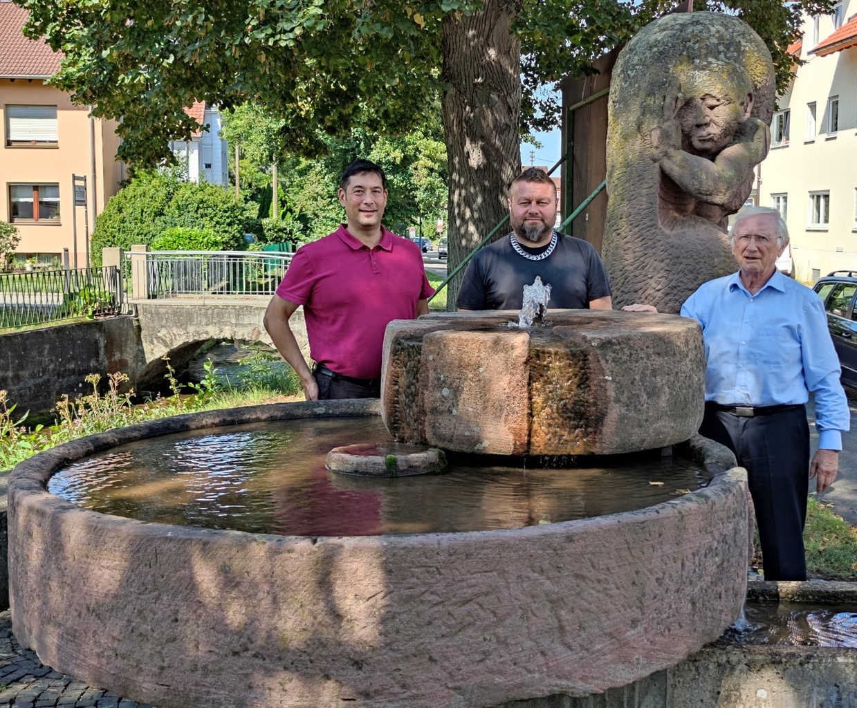Bürgermeister Markus Hollemann freute sich mit Prof. Dr. Dieter Geuenich und Alfred Beeger vom Wassertrupp des Bauhofs und berichtete: „Die Brunnenanlage ist besonders bei Kindern beliebt und lädt im Sommer zum Planschen ein. Auf der Ruhebank ruhen sich unter der schattenspendenden Linde gern auch ältere Mitbürger aus. Schön, dass der ‚Sackträgerbrunnen‘ wieder sprudelt!“ Dieter Geuenich ergänzt: „Der Blick auf die noch erkennbaren Reste des Mühlenwehrs erinnert an die Zeit, als am Denzlinger Dorfbach noch sieben verschiedene Mühlen betrieben wurden.“