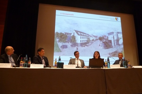 Am Dienstag, 24.09.2019, lud die Gemeinde Denzlingen zur Vorstellung einer Konzeptstudie für das Areal „Grüner Baum“ in das Kultur & Bürgerhaus ein. Nach einleitenden Worten von Bürgermeister Markus Hollemann erläuterten Verbandsbauamtsleiter Carsten Müller und Architektin Petra Habammer (Habammer Leiber Architekten) die Konzeptstudie unter Bezugnahme auf die gemeindlichen Vorgaben. Mit am Tisch saßen auch Jürgen Lange-von Kulessa, der die Konzeptstudie als Geschäftsführer der Ergo-nInvest in Auftrag gegeben hat, sowie Verkehrsplaner Dr. Frank Gericke vom Büro Modus Consult.